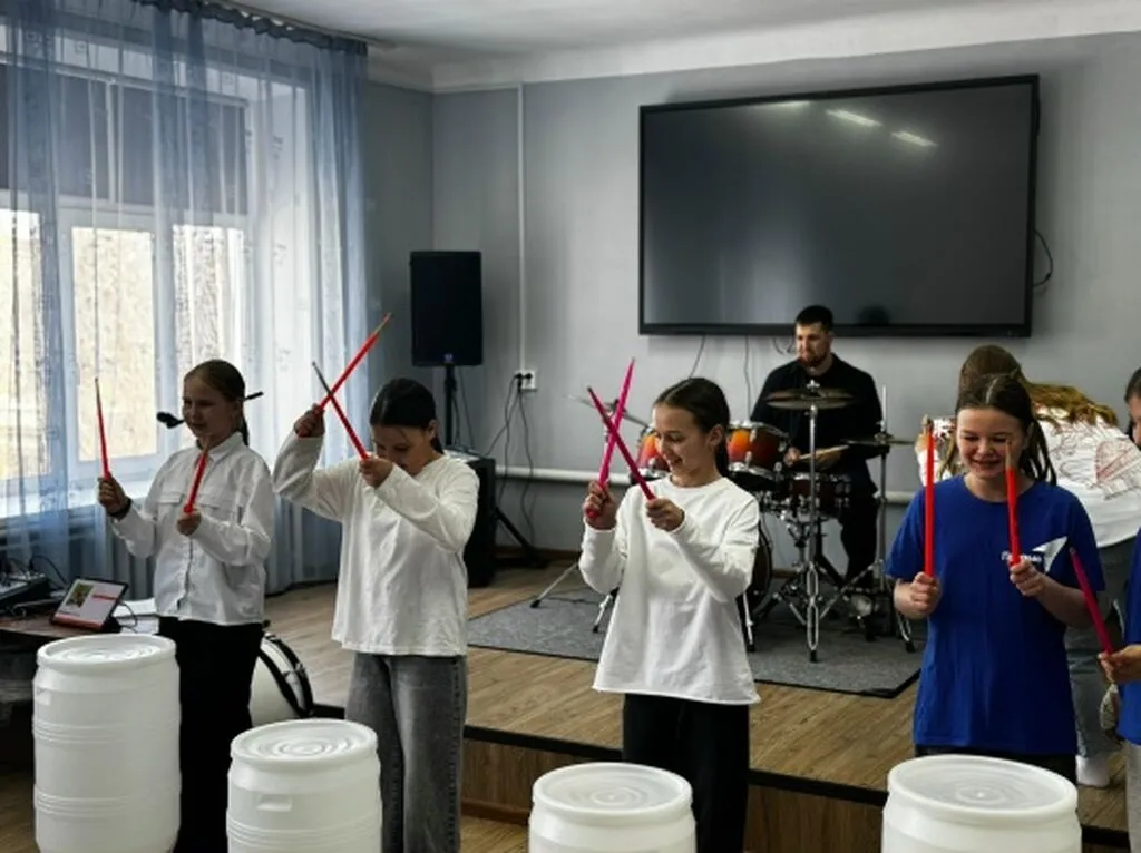 Беседа быстро перешла в интерактив. Под чутким руководством Богдана Геннадьевича ребята взяли в руки барабанные палочки и попробовали себя в роли ритм-секции. Пошуметь получилось от души!